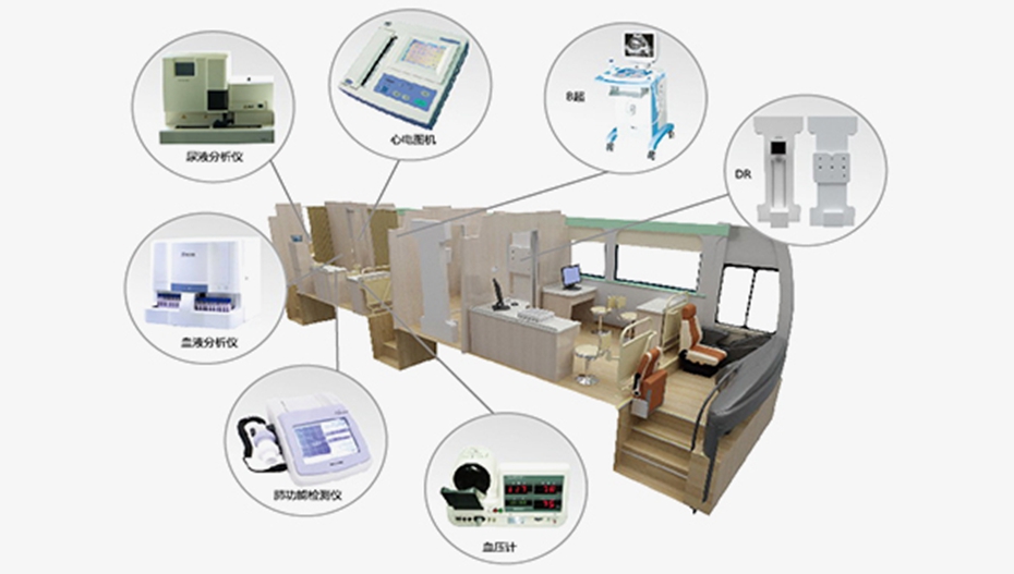 體檢車內配置有線局域網和4G無線網絡,可實現B超、心電圖、DR、純音電測聽等體檢結果數據自動匯總,打印報告;與站內互聯,信息傳回站內;自動上傳云平臺,實現遠程會診。