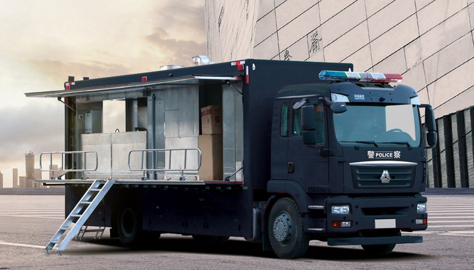 該車型選用汕德卡二類底盤改制,主要由底盤、艙體、炊事設施、水路系統、電氣系統等組成,主要為野外執勤人員提供齊全的炊事設施,也可做電源車使用對外供電。采用重汽底盤,車速高、機動能力強、可靠性高