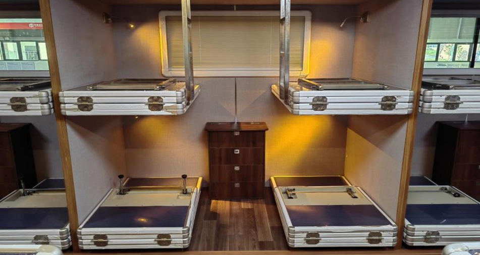 室內(nèi)住宿設備為12組高低床,共可提供24人住宿。收攏狀態(tài)下,床鋪可折 疊,當箱體展開后可迅速翻轉(zhuǎn)組合成12組高低床,組合時間不超過5分鐘。 所有上下鋪采用火車臥鋪標準,上下床鋪合理布置,每個床鋪尺寸為長1850mm 寬600mm,床鋪設置于方艙兩側(cè)且可翻轉(zhuǎn)180°折疊,方艙中間為人行過道, 床鋪完全展開后過道寬度0.6m