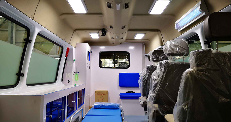 內飾均采用高分子環保材料,易清潔、消毒,有效保障車內衛生條件,提升病人運送過程中的安全性 ,同時地板采用重量輕、環保且可二次利用的裝飾材料,便于醫護人員的清潔、整理。