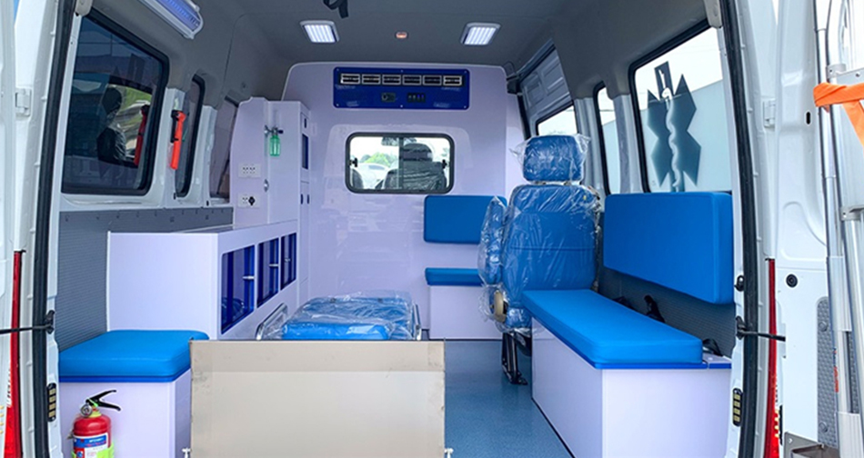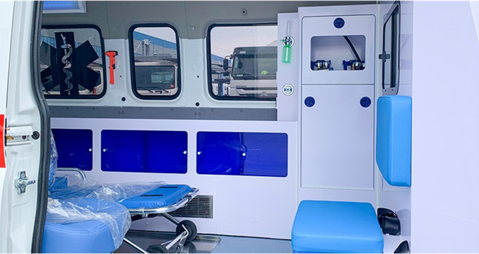 內飾均采用高分子環保材料,易清潔、消毒,有效保障車內衛生條件,提升病人運送過程中的安全性 ,同時地板采用重量輕、環保且可二次利用的裝飾材料,便于醫護人員的清潔、整理。